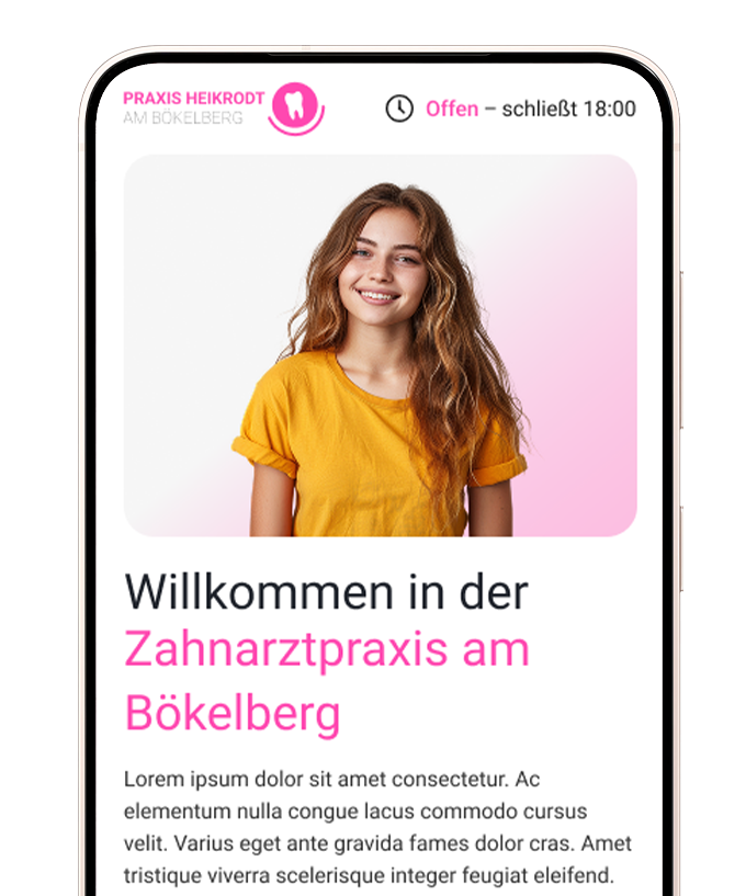 Unsere Praxis-Produkt-Webseiten denken mit, laden schnell und führen Patient:innen intuitiv zum Ziel – auf jedem Gerät. Kein Suchen, kein Scrollen – nur ein klarer Weg zur Terminbuchung. So einfach, dass es sich nicht wie eine Website anfühlt, sondern wie Ihre Praxis – nur digital.
